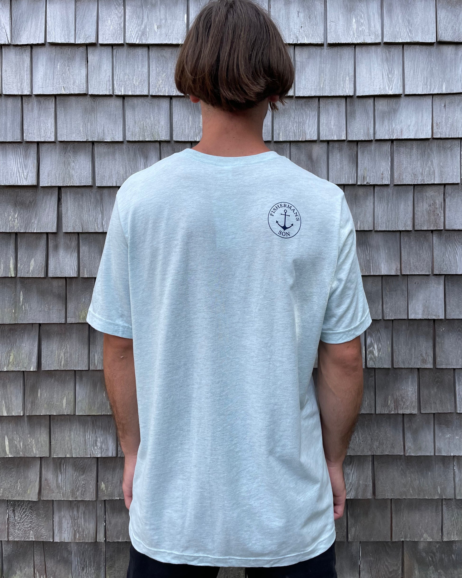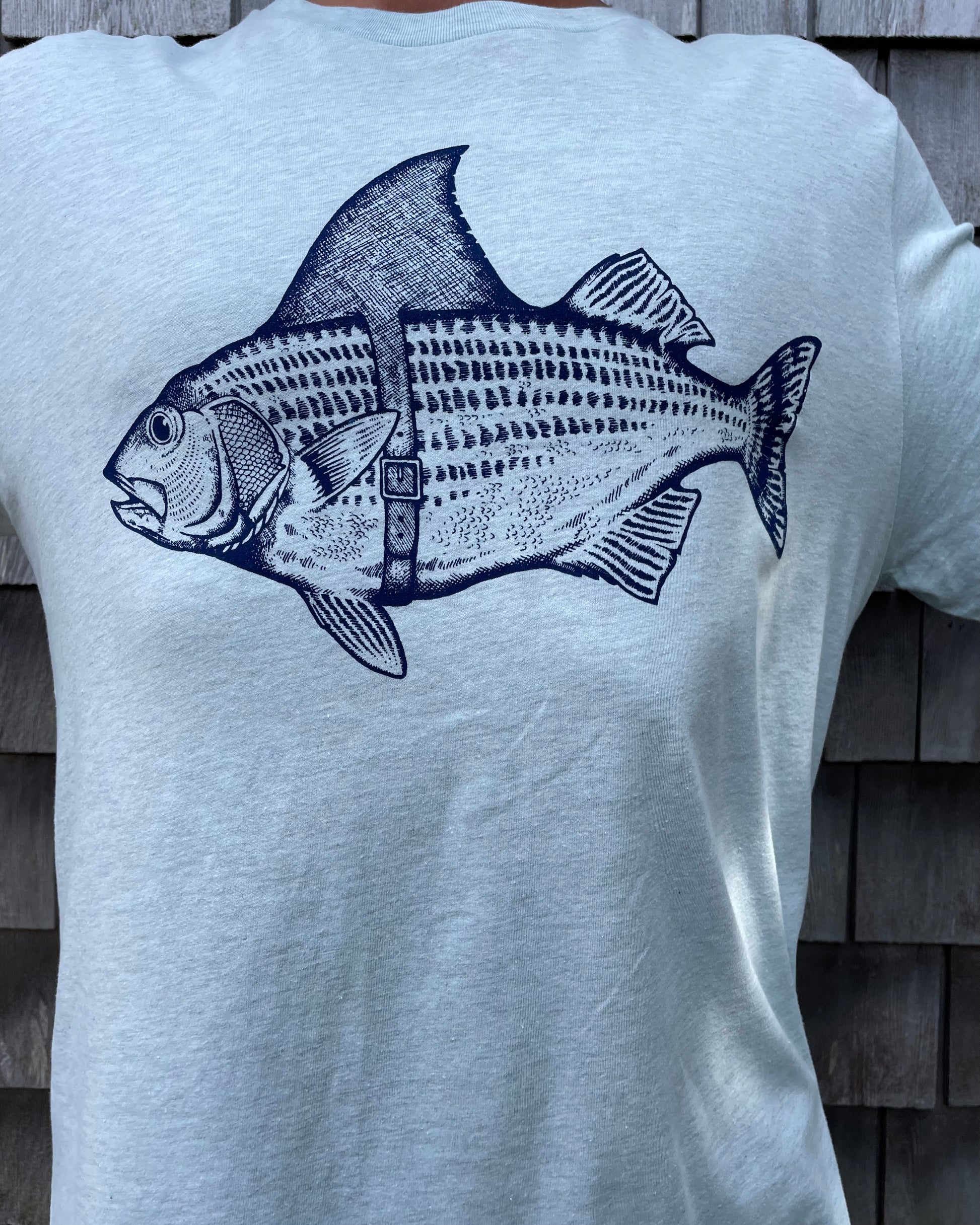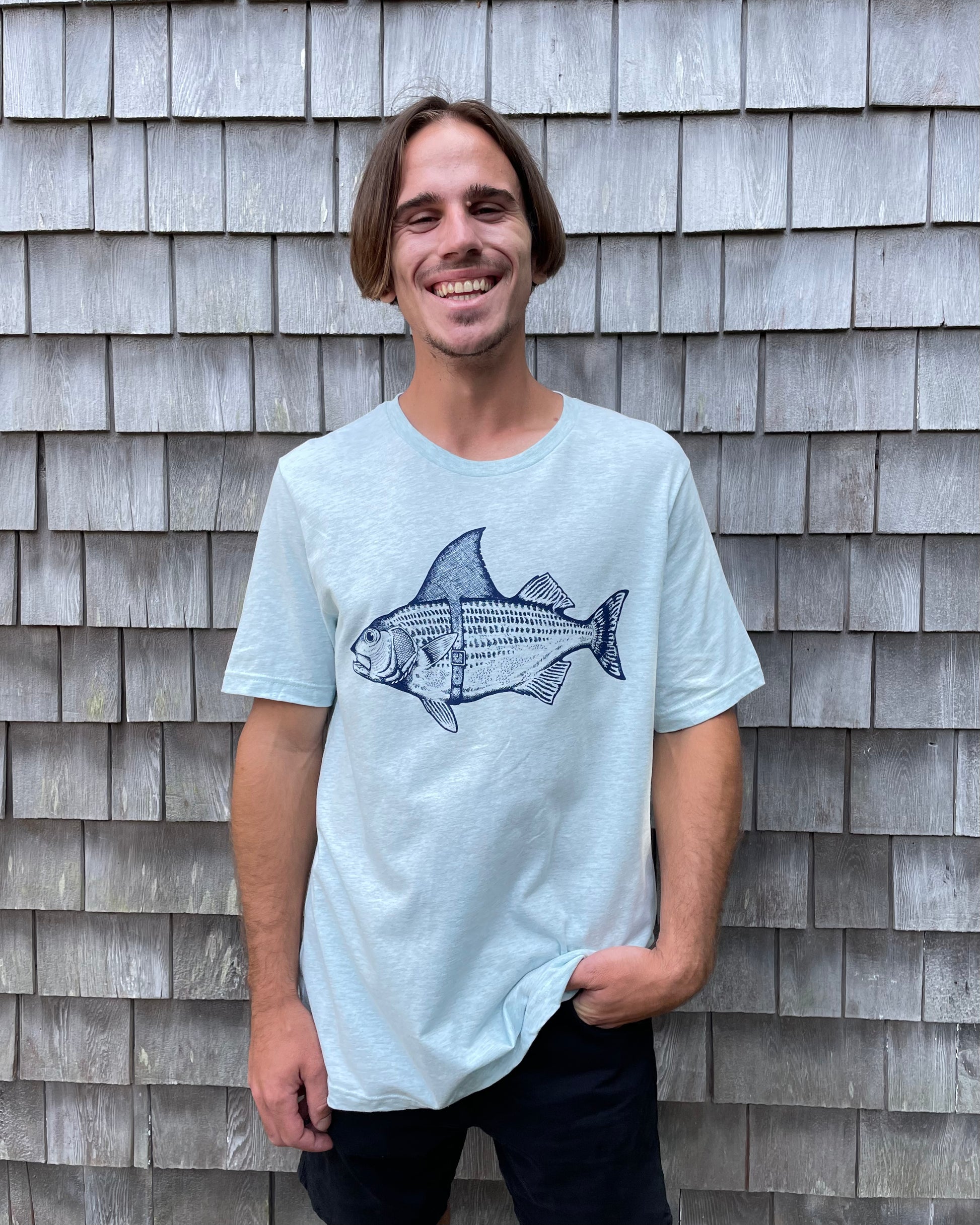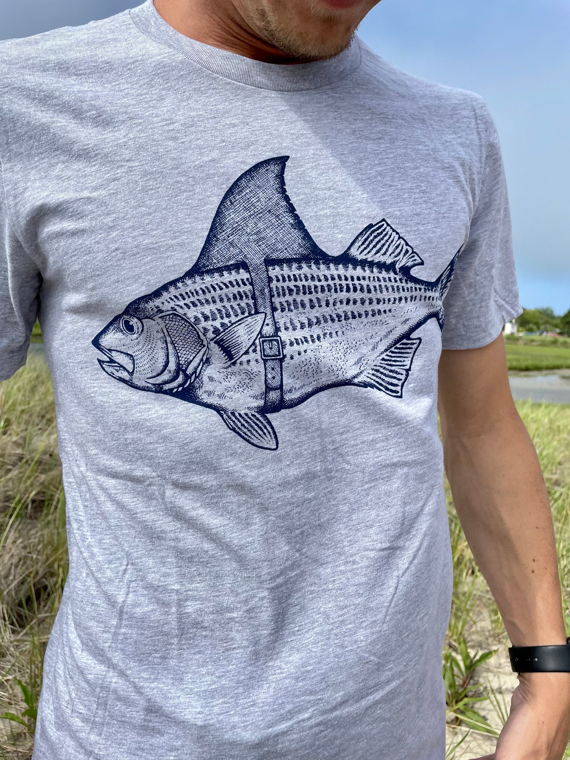 The must have hilarious "Bass Shark Fin" t-shirt. The story behind the Striped Bass wearing a shark fin belt is that he wants to trick the fishermen into thinking that he is a shark, in hopes to avoid being caught. This whimsical design is printed on a Bella Canvas t-shirt and finished off with our "Fisherman's Son" logo on the back right shoulder. This shirt fits true to size.
