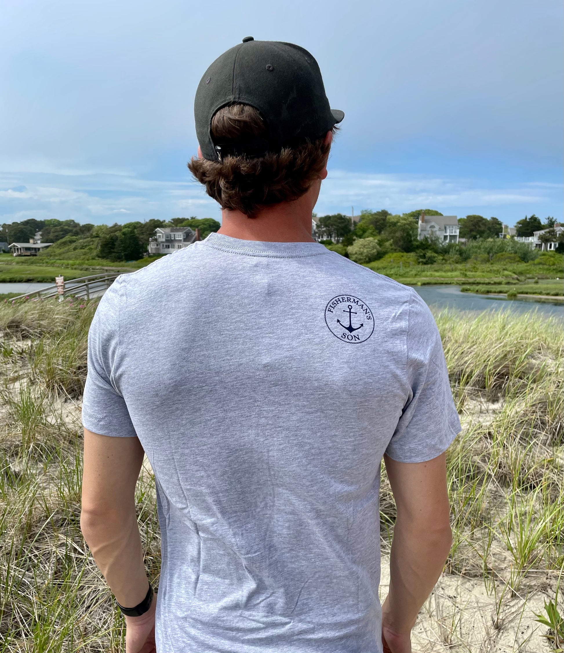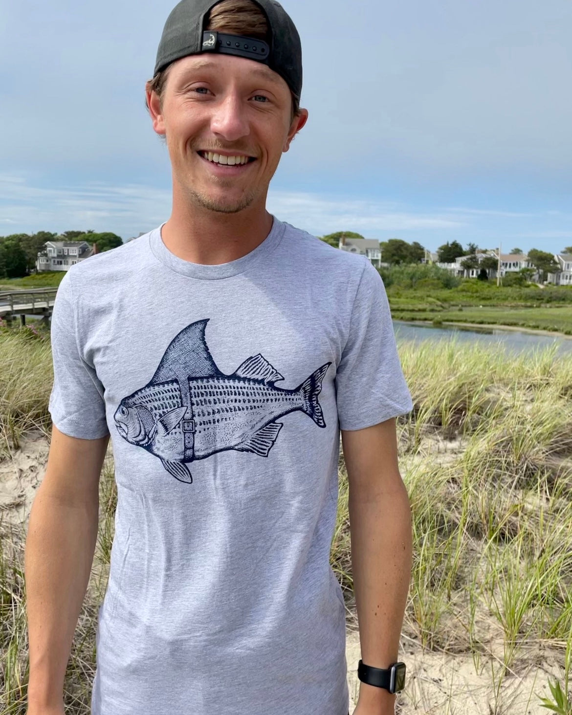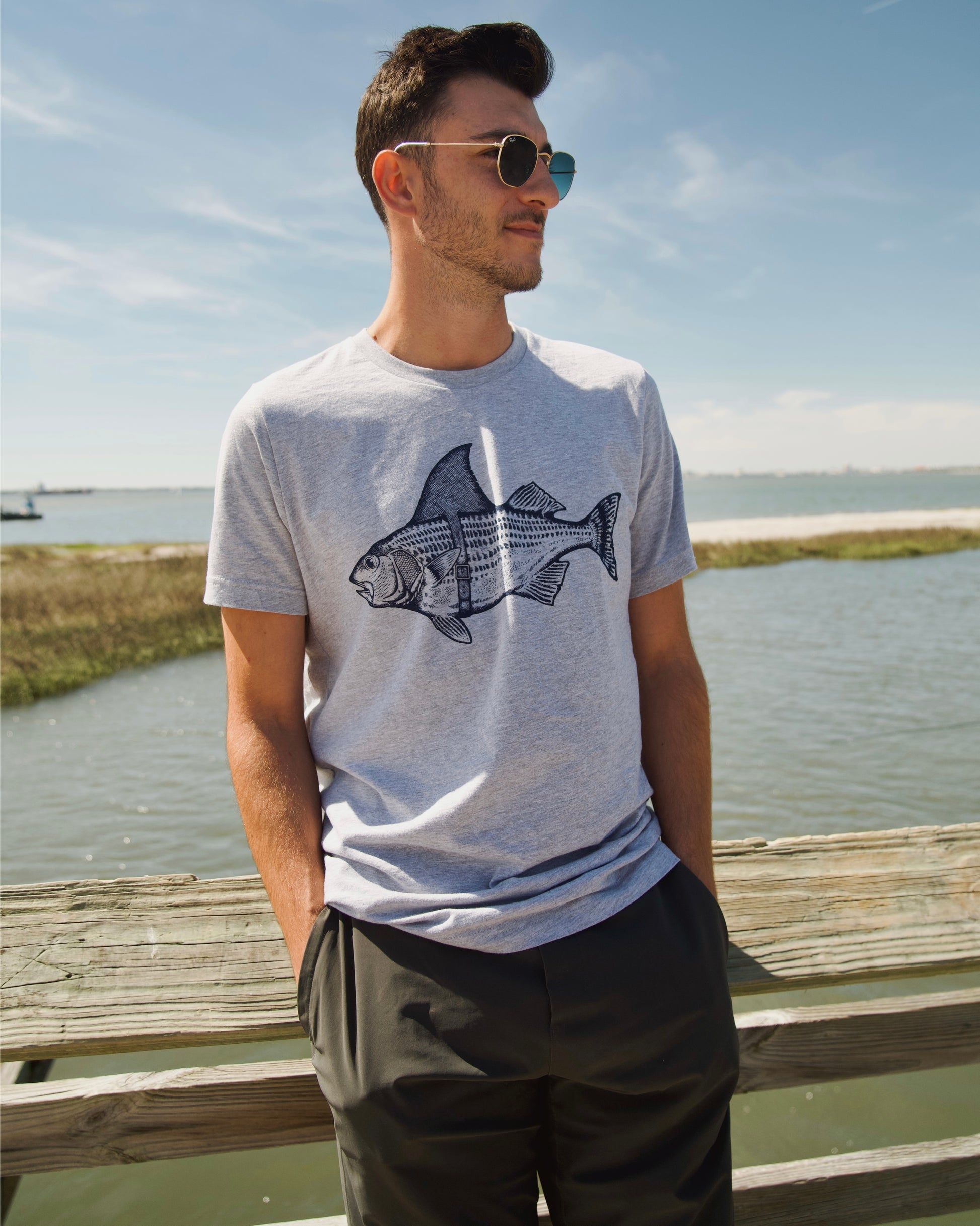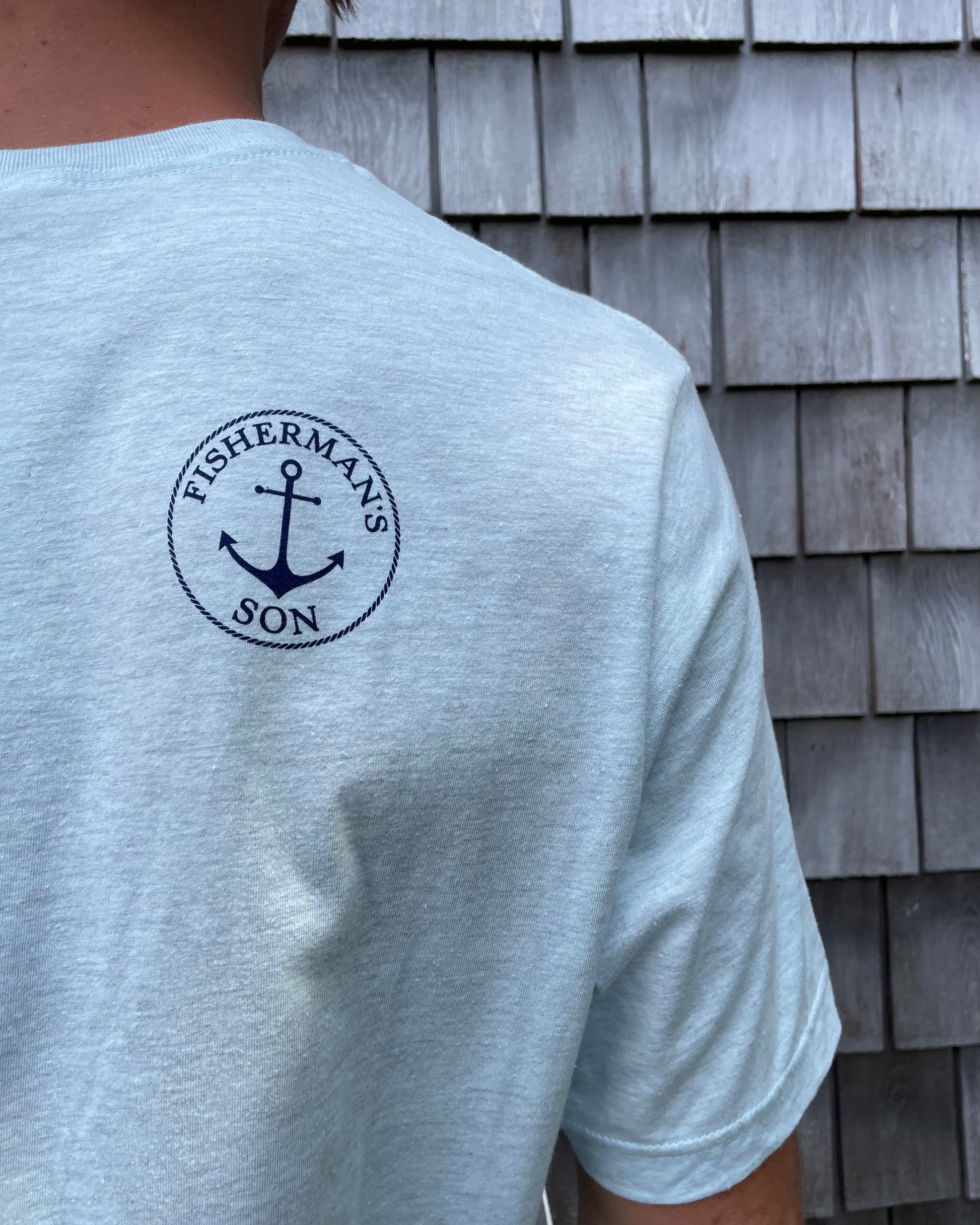 The must have hilarious "Bass Shark Fin" t-shirt. The story behind the Striped Bass wearing a shark fin belt is that he wants to trick the fishermen into thinking that he is a shark, in hopes to avoid being caught. This whimsical design is printed on a Bella Canvas t-shirt and finished off with our "Fisherman's Son" logo on the back right shoulder. This shirt fits true to size.