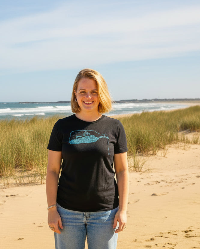 Our classic crew tee available in blue and black triblend with our bottle boat image printed with eco friendly inks. Fits true to size.