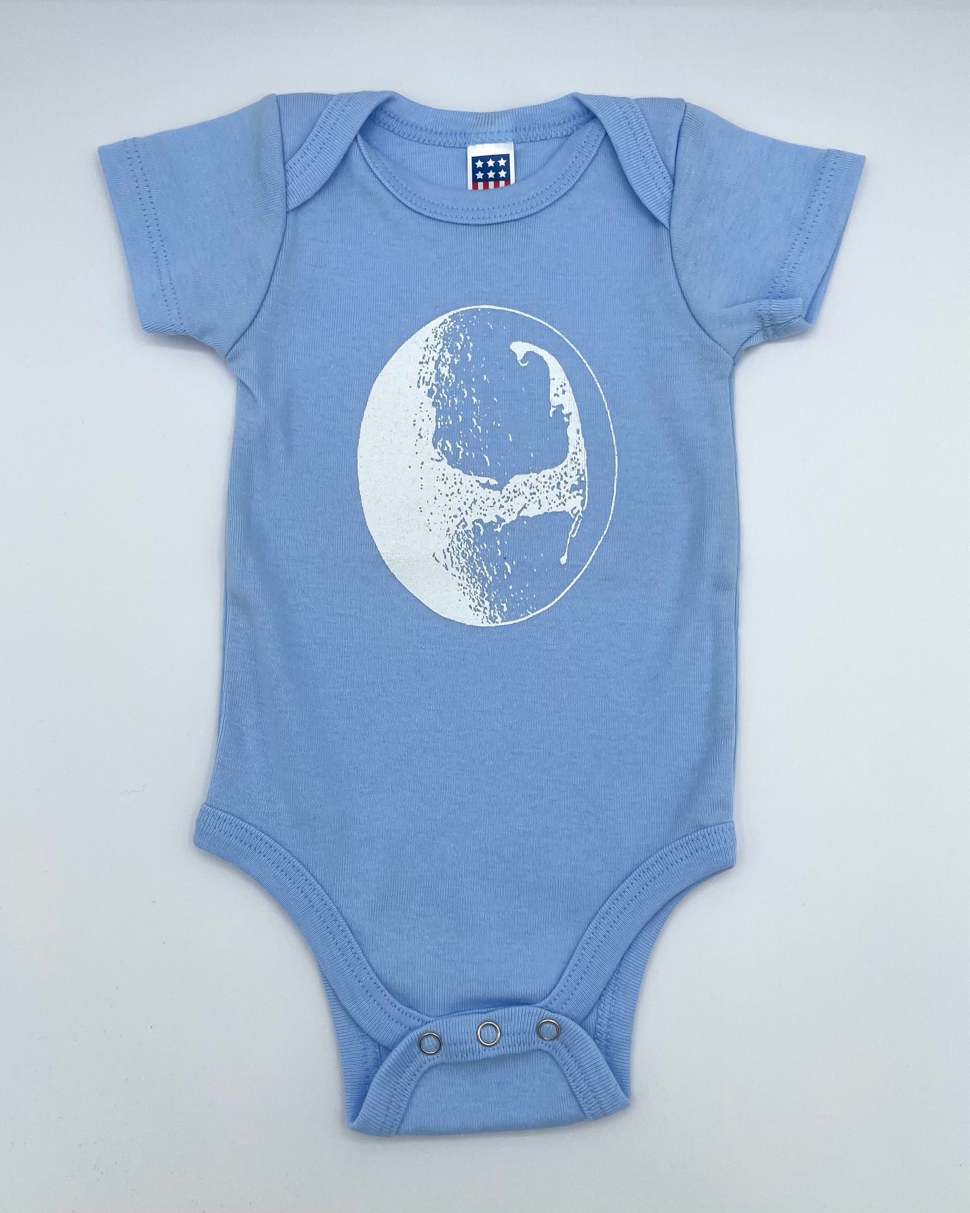 Show your love for Cape Cod by giving the cute little one in your life our darling "Cape Moon" onesie. We printed our graphic in white ink on a baby blue sort sleeve 100% cotton onesie.