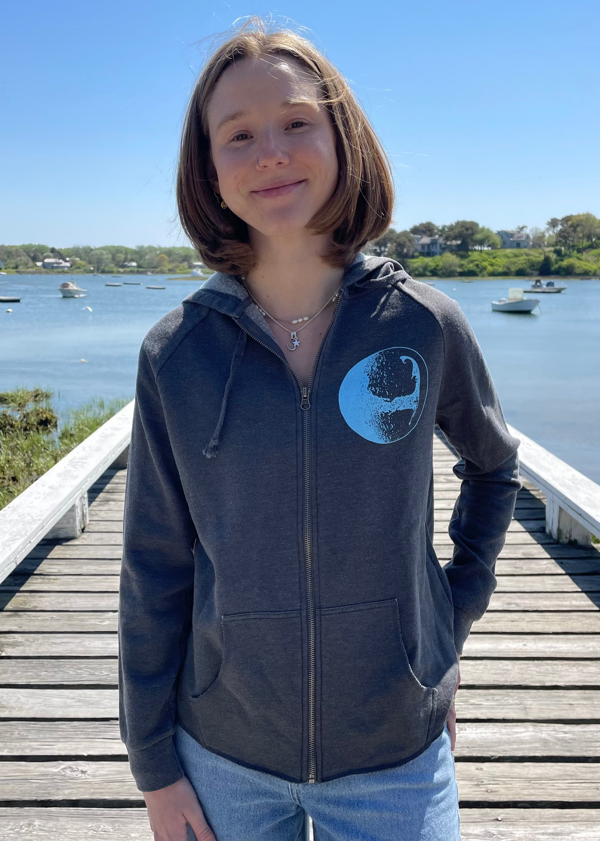 This flattering woman's Independent Trading Company zip hoodie is the perfect piece for the seasons. Printed with the "Cape Moon" graphic on the front left chest and center printed on the back, and finished with the "Fisherman's Daughter anchor logo" on the right side of the hood. This garment is fitting true to size.
