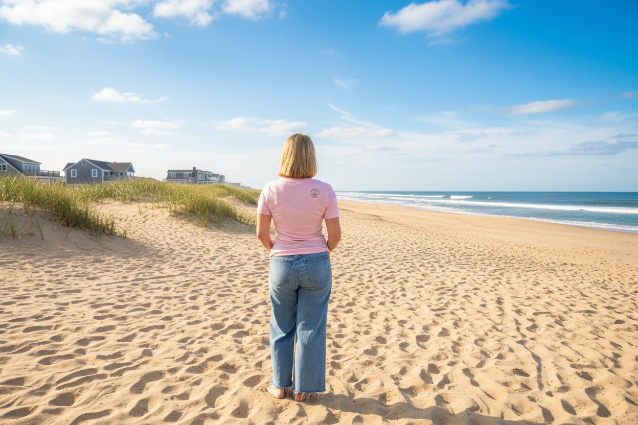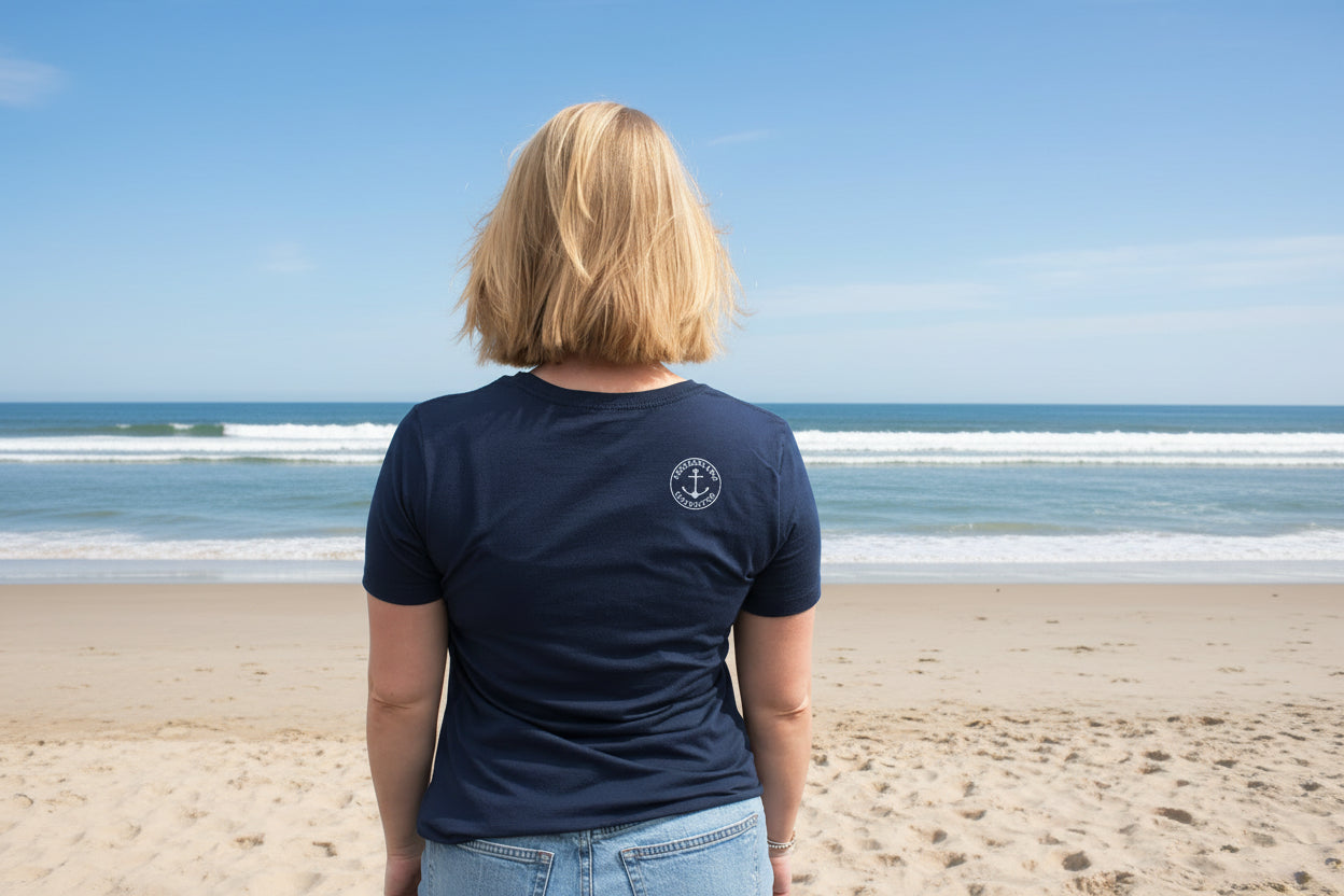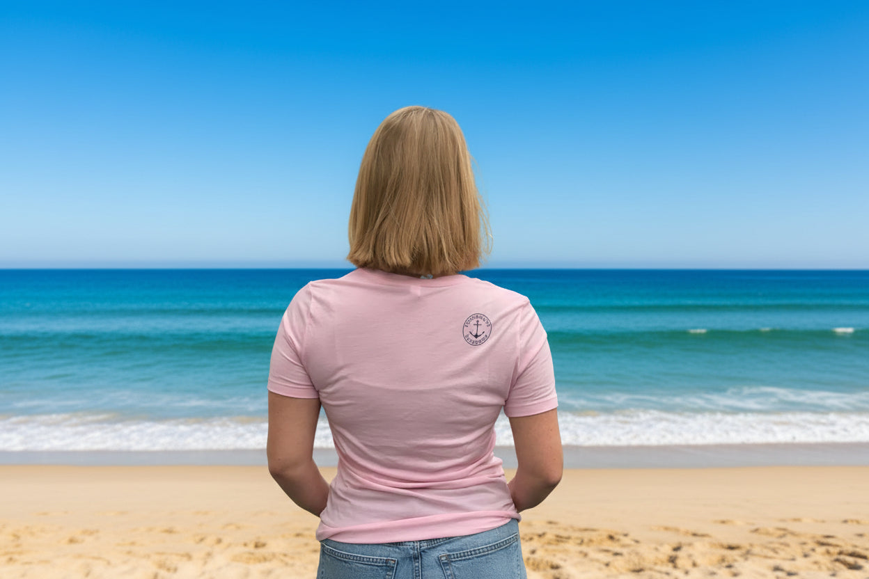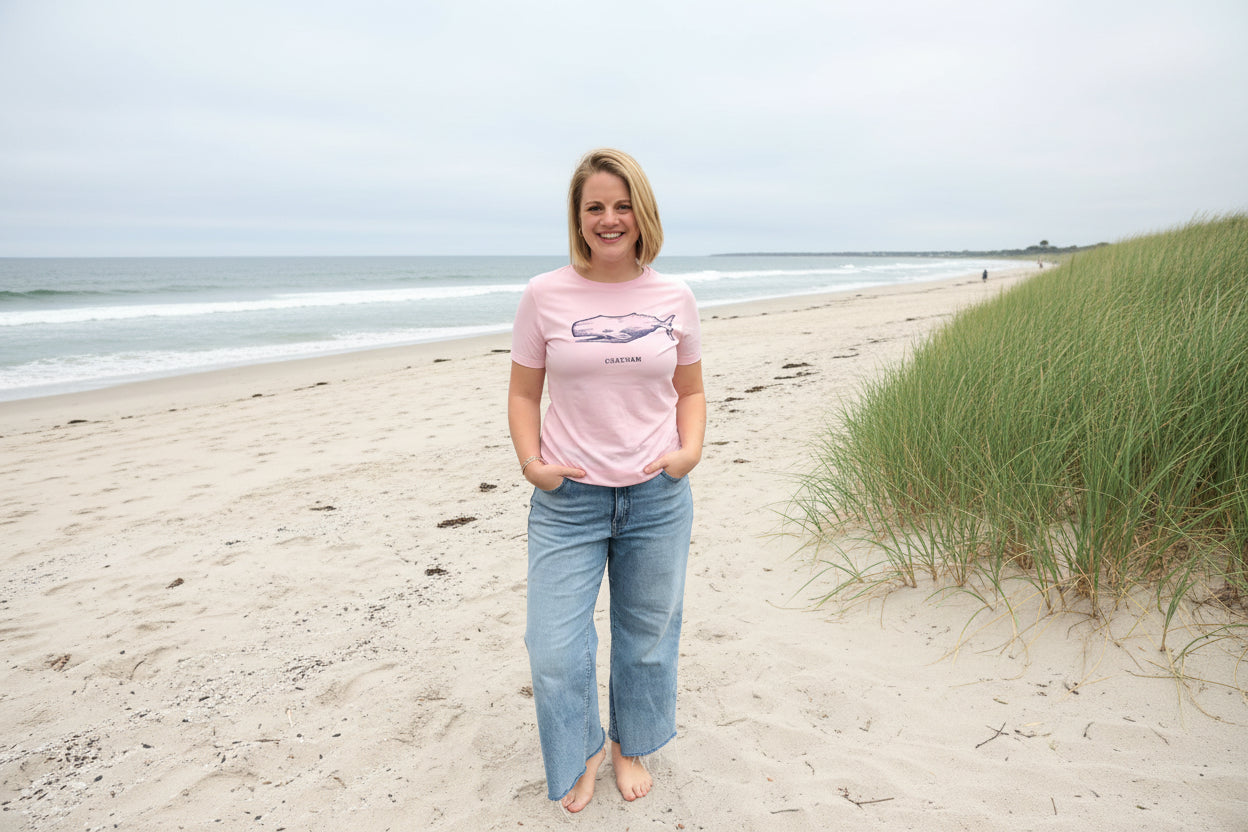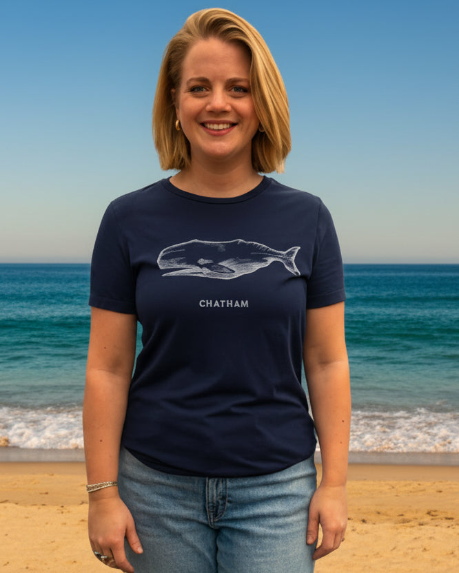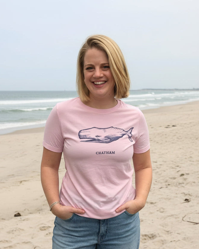 Our classic crew tee available in navy and pink with our Chatham Whale image printed with eco friendly inks. Fits true to size.