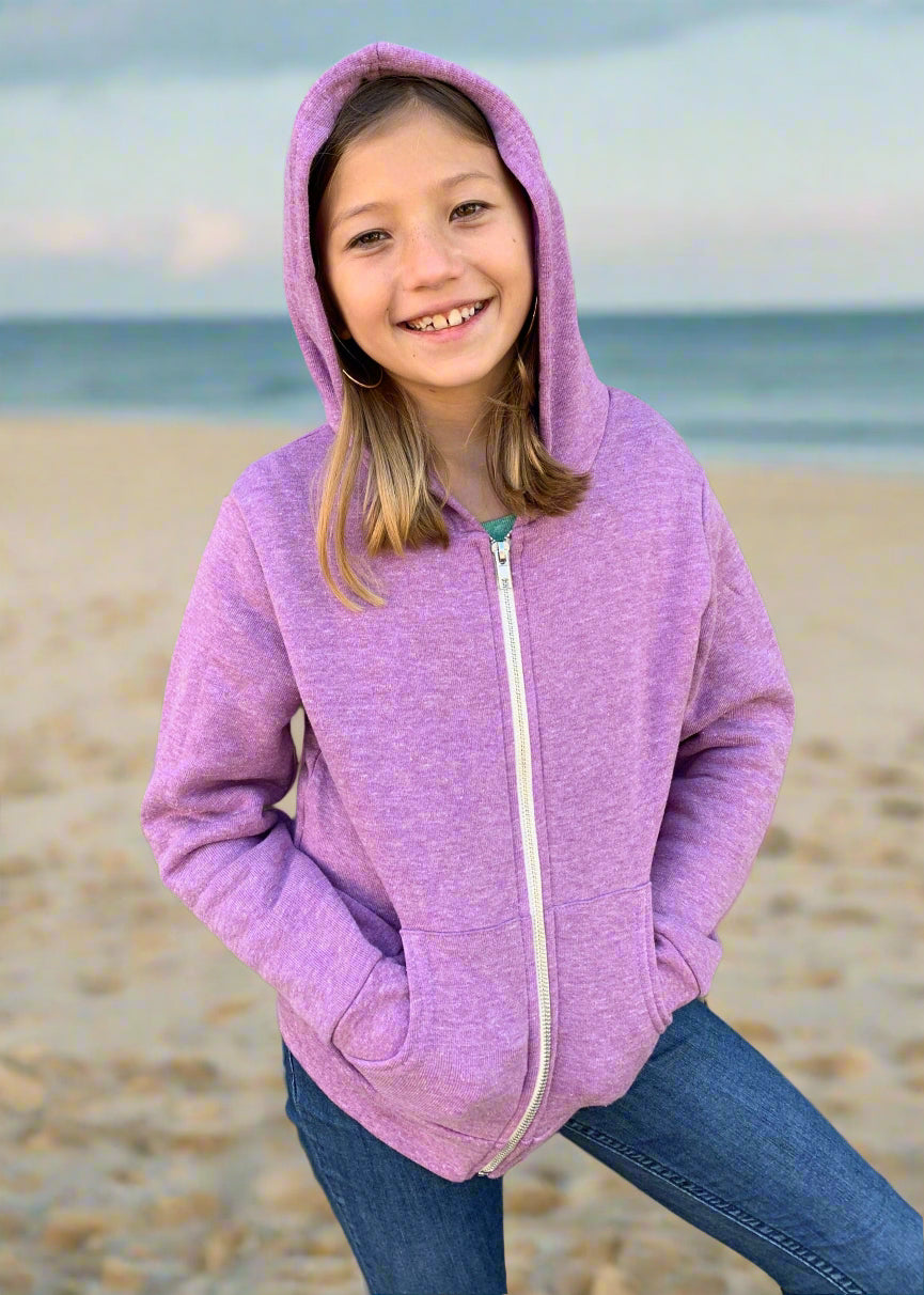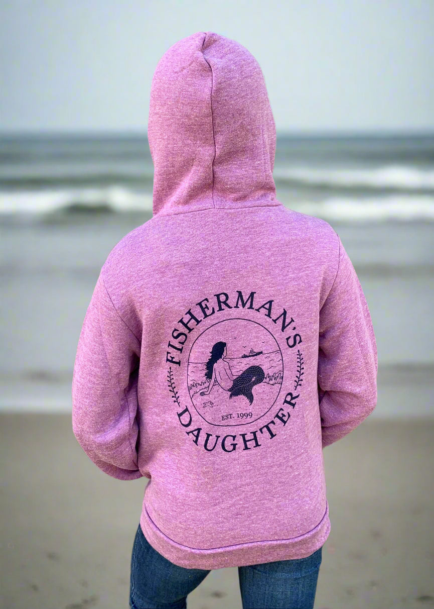 We printed our "Fisherman's Daughter Mermaid" logo in navy ink on the center back of this very soft Royal Apparel kids zip hoodie. This great hoodie is the perfect piece for layering to school or playing outside.