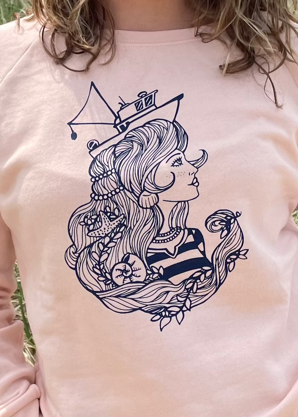 This cozy Fisherman's Daughter "Figure Head" print is perfect for year-round wear. Printed on a light peach mid-weight fleece Independent Trading Company pullover in navy ink complete with our "Fisherman's Daughter Anchor logo" on the center back. This crew neck pullover has a ducktail bottom finish and it fits true to size.