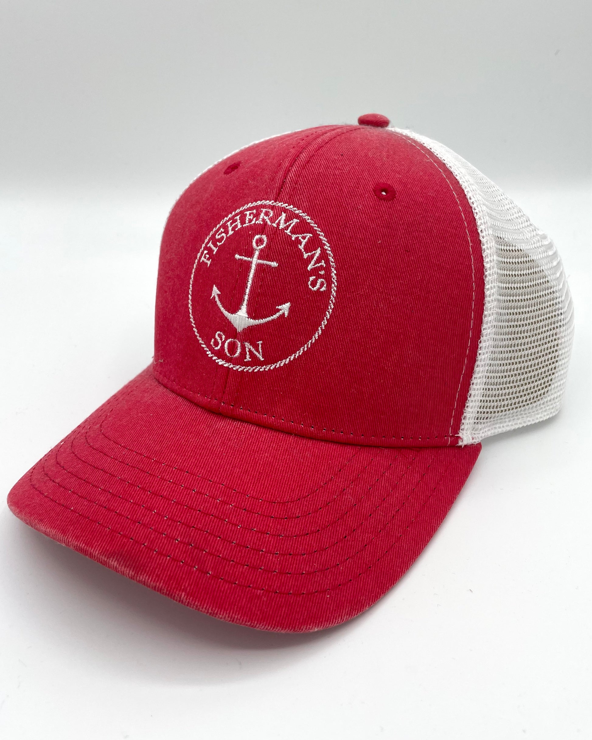 Our "Fisherman's Son Anchor" logo graphic embroidered on the front of a classic red snapback baseball hat. The back of the hat is a white mesh and has adjustable snaps to fit comfortably to your head.