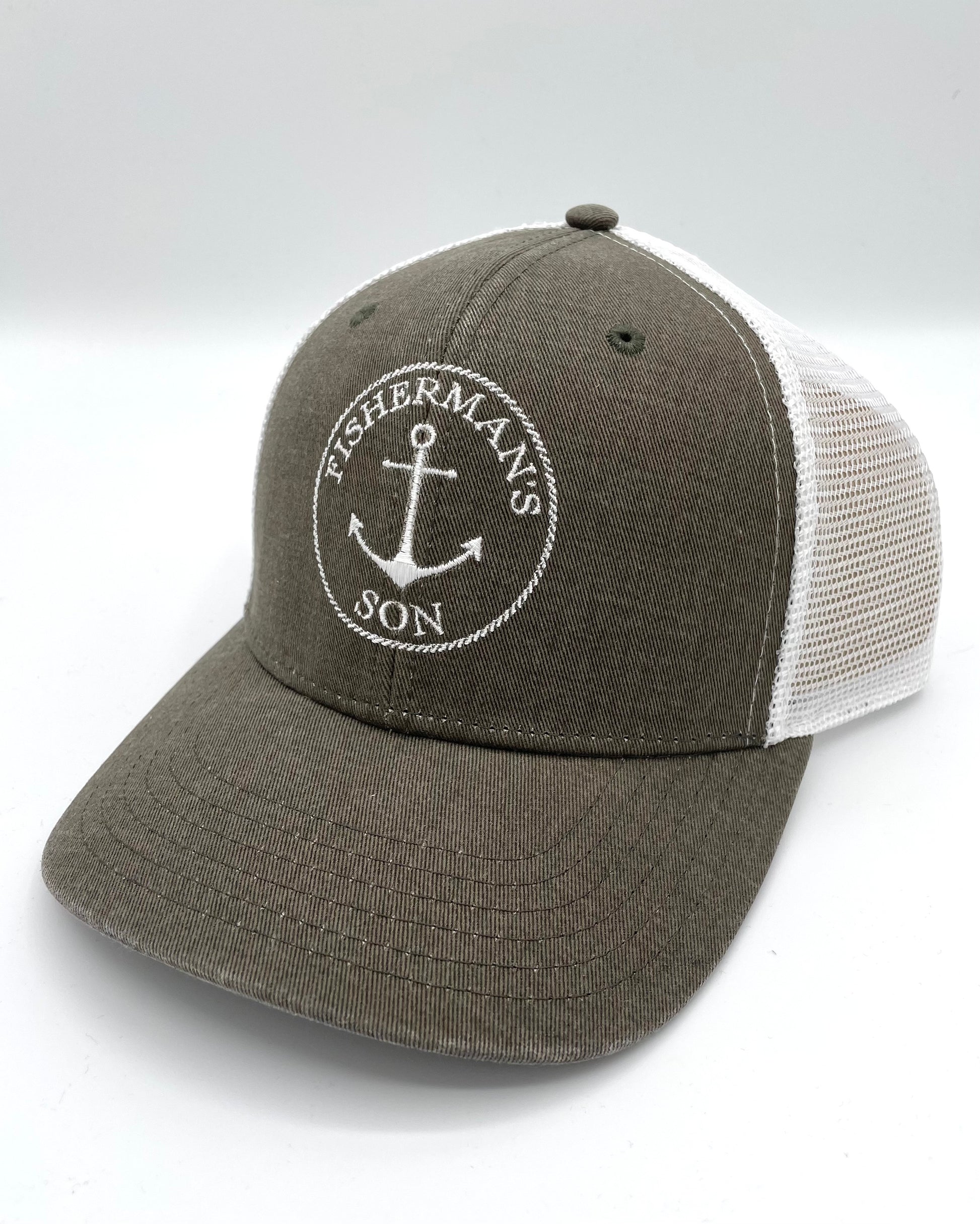 Our "Fisherman's Son Anchor" logo graphic embroidered on the front of a classic army green snapback baseball hat. The back of the hat is a white mesh and has adjustable snaps to fit comfortably to your head.