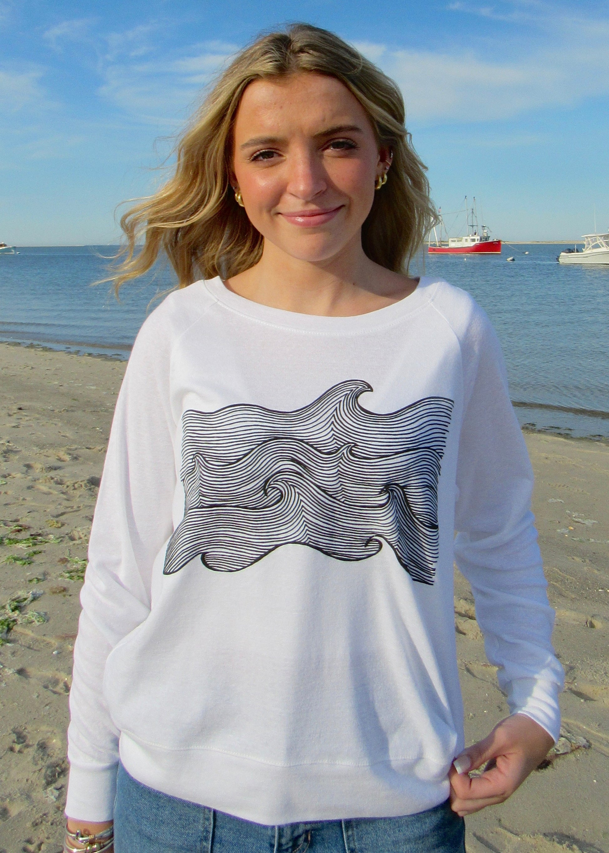 Lightweight white long sleeve pullover with the FD Life Comes In Waves print in black eco-friendly ink. Our "fish head" print in the center on the back. Narrow fit so we recommend to size up.