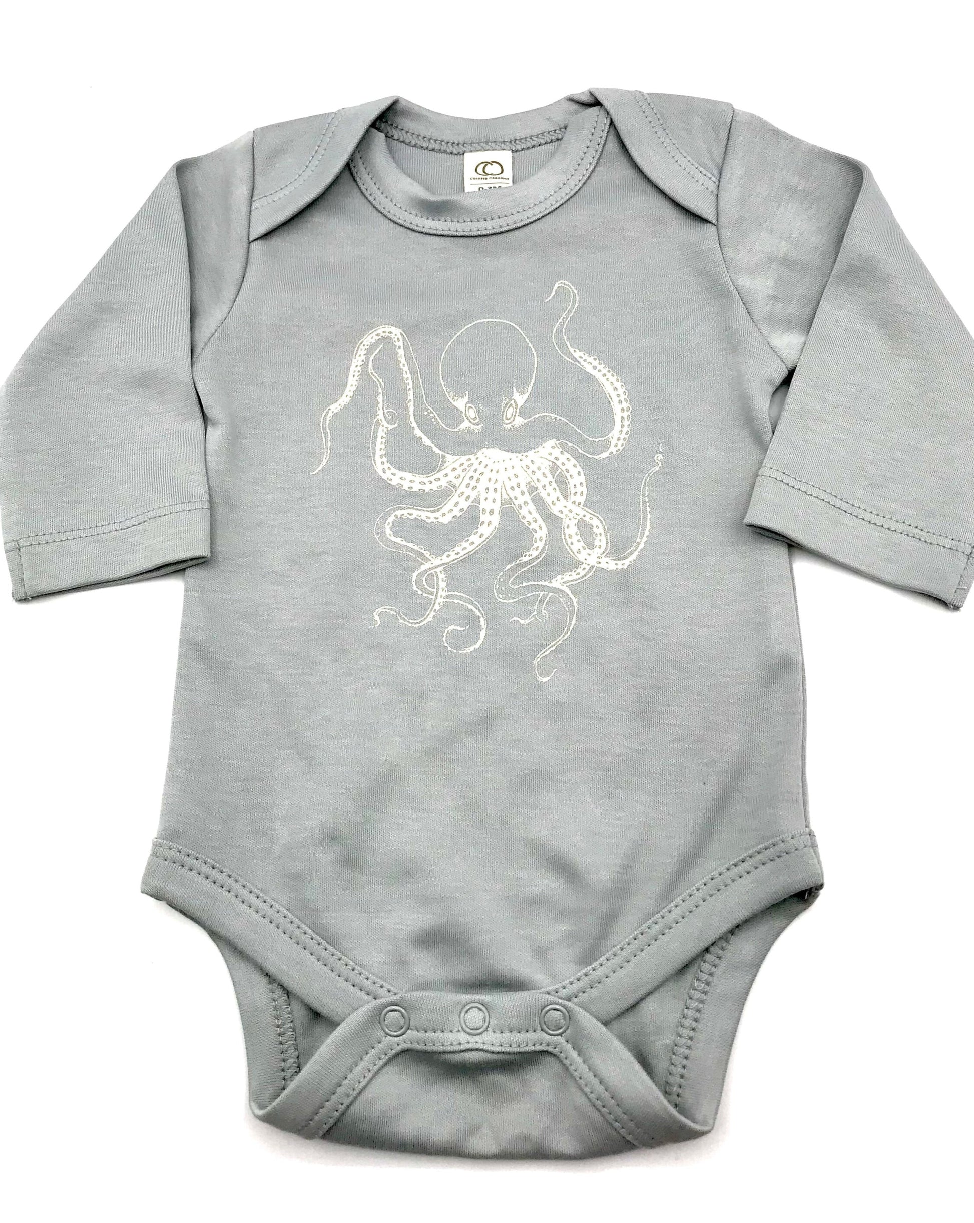 Our sweet "Octopus" design printed on a 100% organic cotton long sleeve onesie to keep your little one cozy and warm all year round. We printed the graphic in a navy ink on a cream colored onesie and in a white ink on a mist colored onesie.