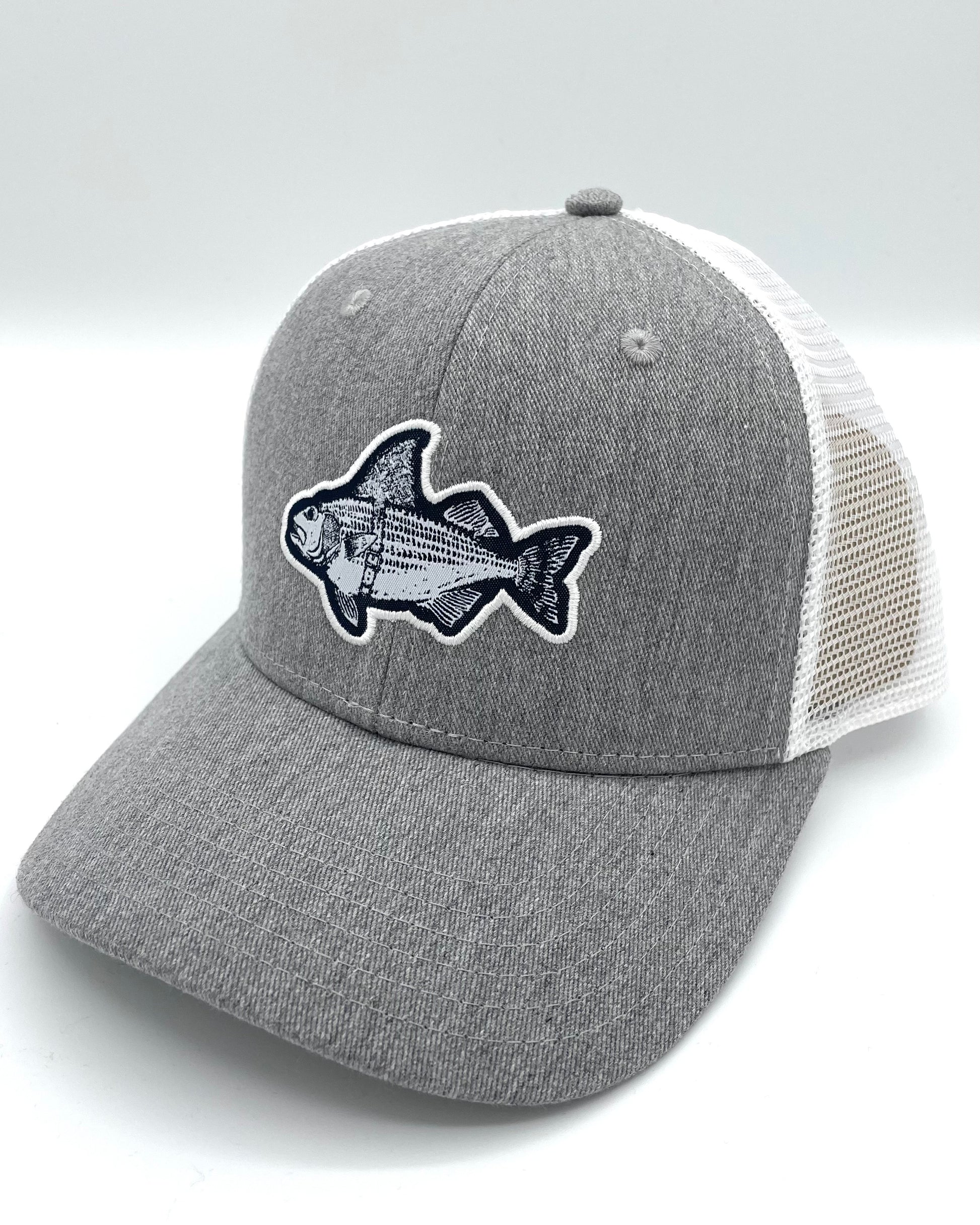 We printed our "Shark Fin Bass" graphic on an embroidered patch on the center front of a classic snapback hat. This hat features a gray front and white mesh on the back. This hat comes with an adjustable strap on the back to fit comfortably to your head.