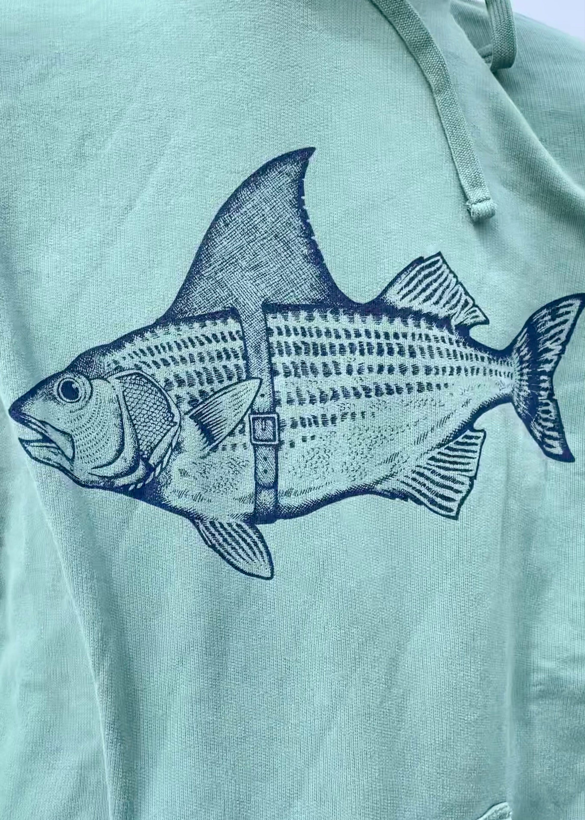 Our very lovable and hilarious "Bass Shark Fin" design screen printed on a cypress green Independent Trading Company pigment dyed pocket hoodie. This sweatshirt is finished off with our signature "Fisherman's Son" anchor logo on the right side of the hood. This sweatshirt fits true to size.